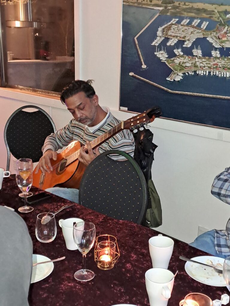 Udover al det satans lækkert mad, kom Adnan også med lidt guitar spil til os, for en ekstra hyggelig tilføjelse. Omkring kl. 22.00 begyndte vi at rejse os lidt. Mætte af al den gode mad, alle de gode oplevelser og den rigtig rigtige dejlige samvær med gode mennesker